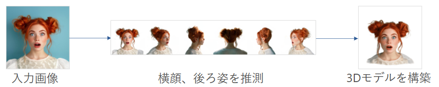 これには潜在拡散モデルが使用されており、Era3Dなどの既存研究の知見も活用されています。重要なのは、生成された側面・背面画像が: