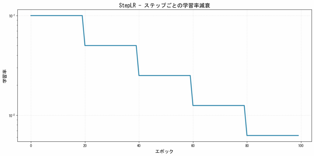 指定したステップ(エポック)ごとに学習率を一定の割合で減少させるシンプルなスケジューラーです。