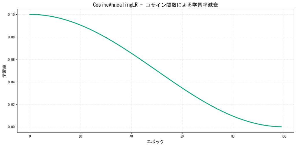 学習率をコサイン関数に従って減少させるスケジューラーです。画像分類タスクで広く使用されています。