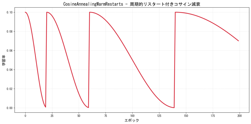 コサイン減衰に周期的なリスタートを加えたスケジューラーです。SGDR(Stochastic Gradient Descent with Warm Restarts)とも呼ばれます。