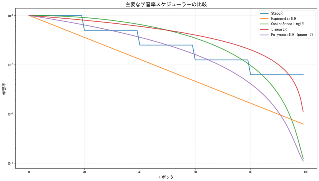 実際のプロジェクトでは、まず標準的なスケジューラー(CosineAnnealingLRやStepLR)から始め、訓練の様子を観察しながら調整していくことをお勧めします。