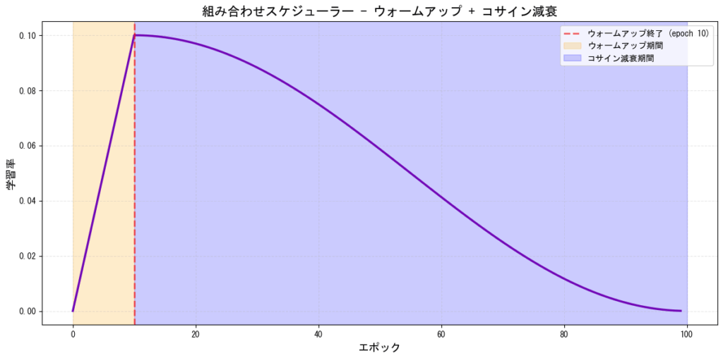 | 自然言語処理(Transformer) | WarmupCosine, LinearLR | ウォームアップが重要、大規模モデルで効果的 |