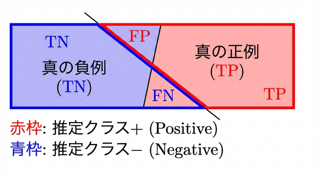 | 実際: Positive | TP(True Positive / 真陽性) | FN(False Negative / 偽陰性) |