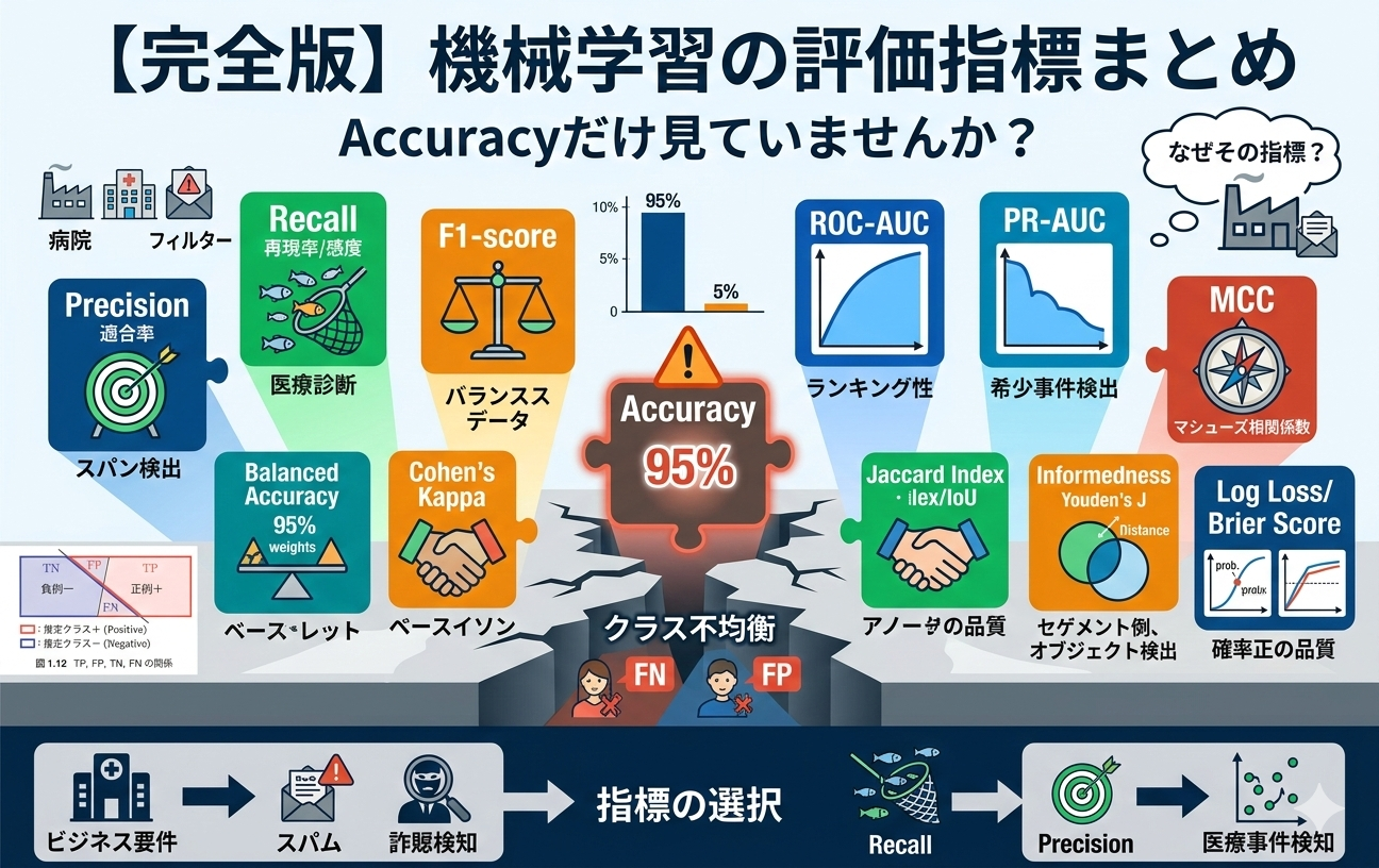 しかし実務では、「Accuracyは当てにならないケースがある」「データの偏りで評価が大きく歪む」「タスクによって最適な指標が違う」という落とし穴がある。実際、クラス不均衡の問題では、Accuracyが高くてもPrecisionが極端に低いケース、最悪の場合はモデルが「全部陰性と答えるだけ」で高Accuracyを達成してしまうことが起こり得る。