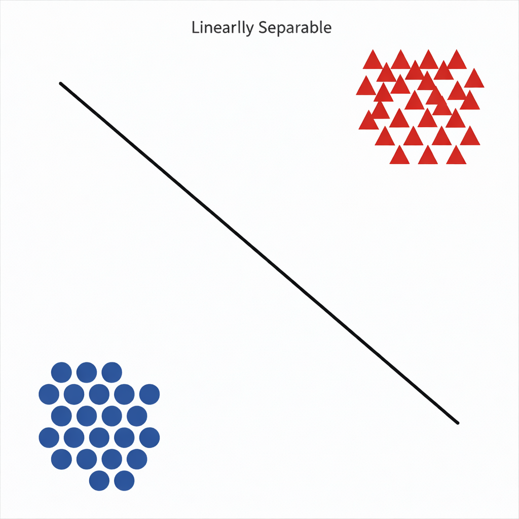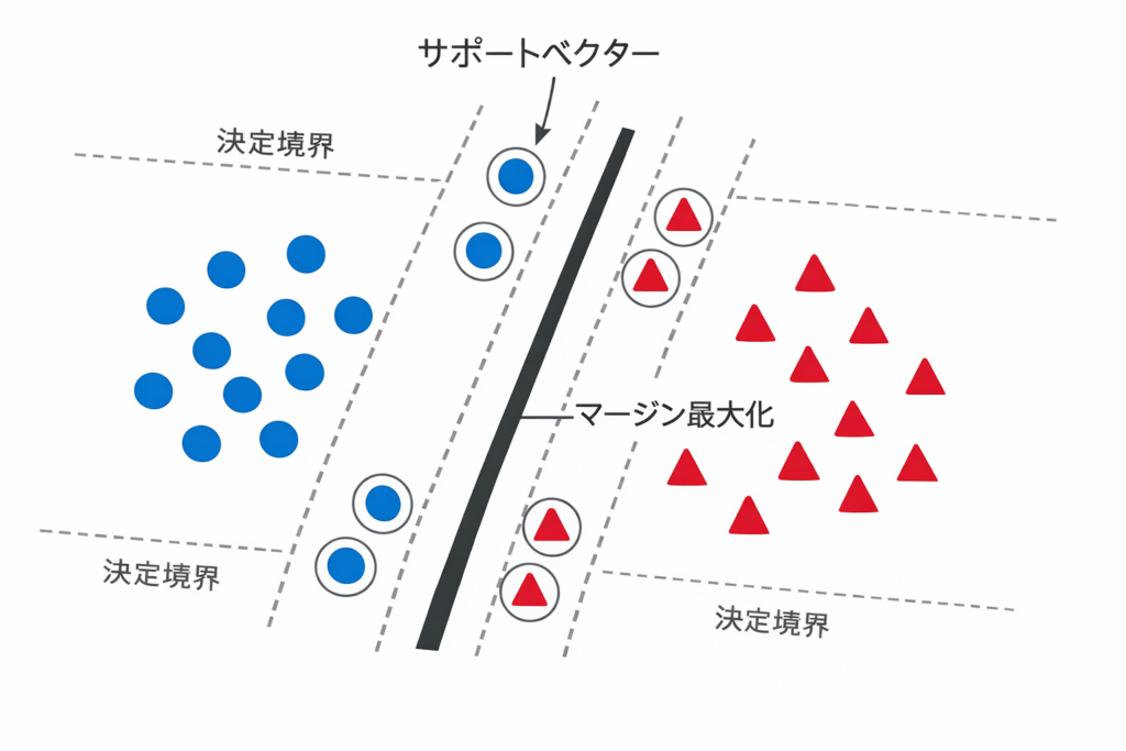 これがSVMの基本思想です。単にデータを分けるだけでなく、マージン(余白)が最大になる境界線を見つけることで、新しいデータに対しても頑健な分類を実現します。